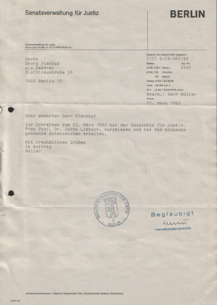 Am 3.3.1992 hat Pientka bei der Justizsenatorin Prof. Dr. Limbach eine Dienst-, Fachaufsichtsbeschwerde gegen die Notare Prof. Dr. Nordemann, Dr. Vinck, Dr. Hertin, die Amtsträger beim Grundbuchamt, den Präsidenten beim LG (Notaraufsicht), die Zivilrichter beim KG Krahn, Görtz, Knorn (KG 2 U 6933/87) und Siering, Schmeißer, Gast (KG 3 U 1223/89) und beim LG Paterok, Rungenhagen, Dr. Gerz-Holzmann (LG 28.0.273/87) sowie Hartmann, Hirschfeld und Knobloch-Steinbach (LG 12.0.272/90) eingereicht.